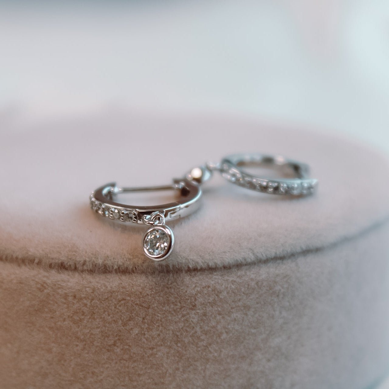Llevan moissanitas de 3 mm (0.10 ct) engastadas a lo largo del contorno y una moissanita colgante central de 4 mm (0.30 ct) que aporta un destello lleno de sofisticación en cada movimiento.