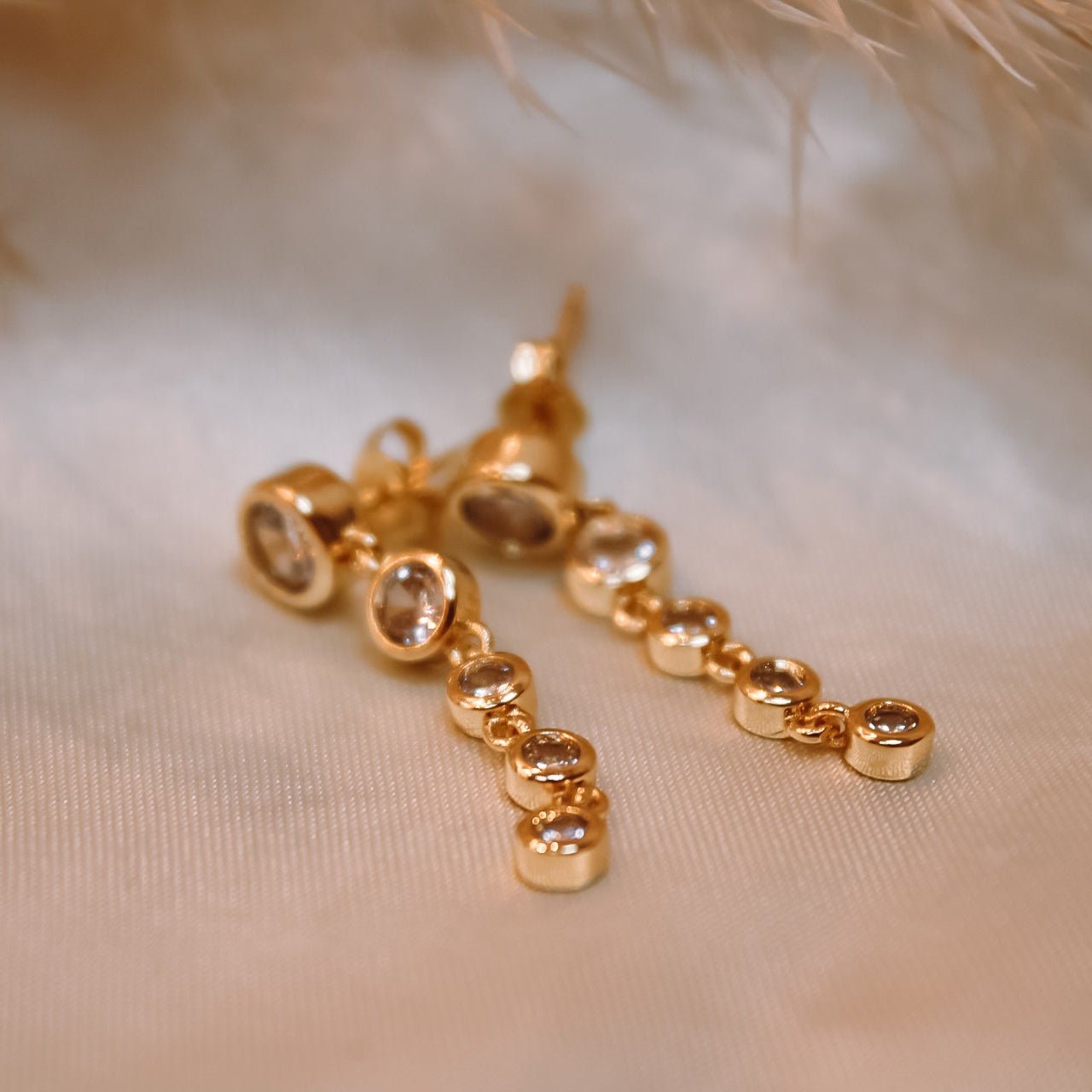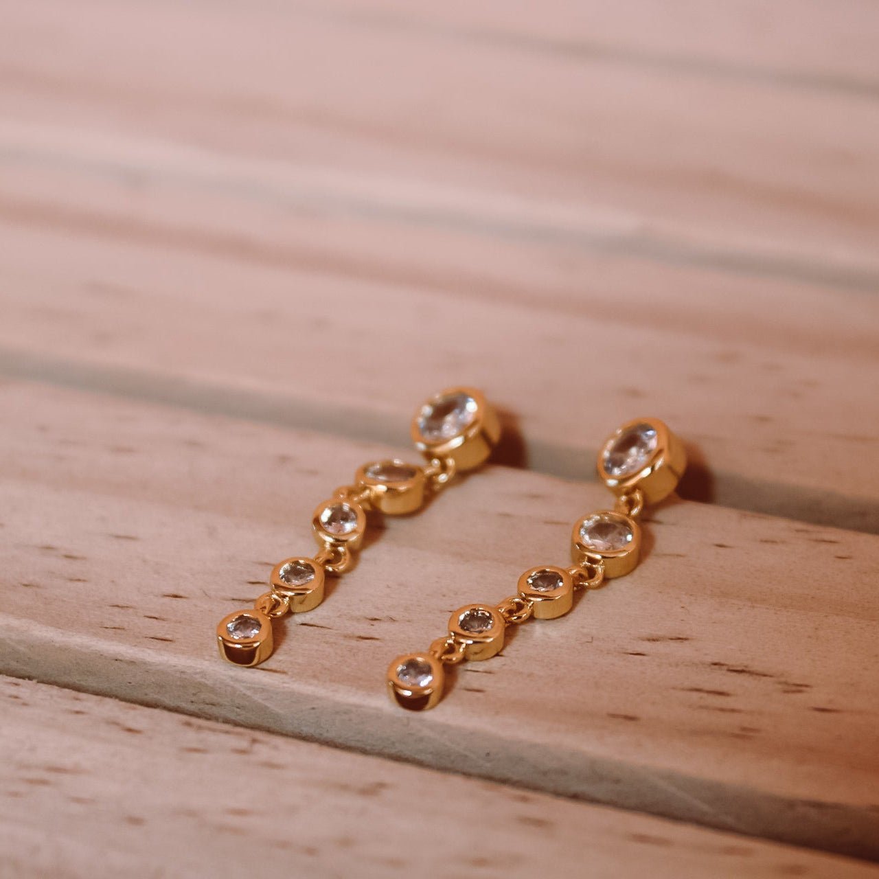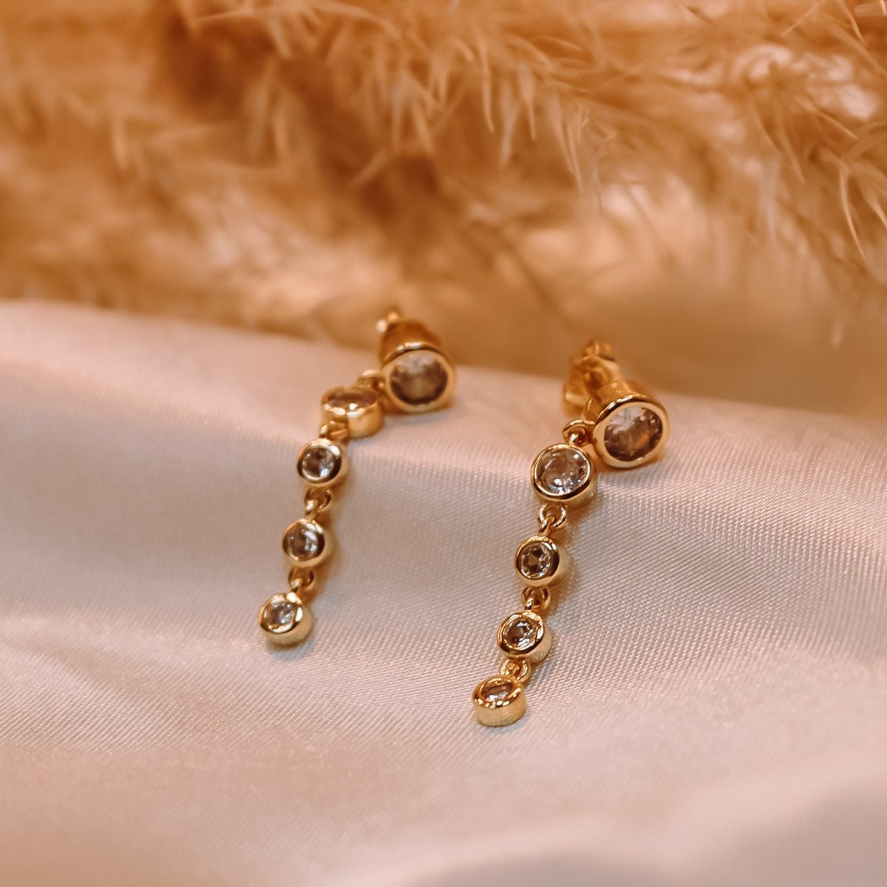 Un diseño delicado que estiliza y aporta luz al rostro. Elaborados en plata de ley 925 con enchape en oro 18k, presentan una caída elegante de 5 circones, dispuestos en formato degradé: más grandes en la parte superior y disminuyendo suavemente hacia abajo, creando un efecto armónico y sofisticado.