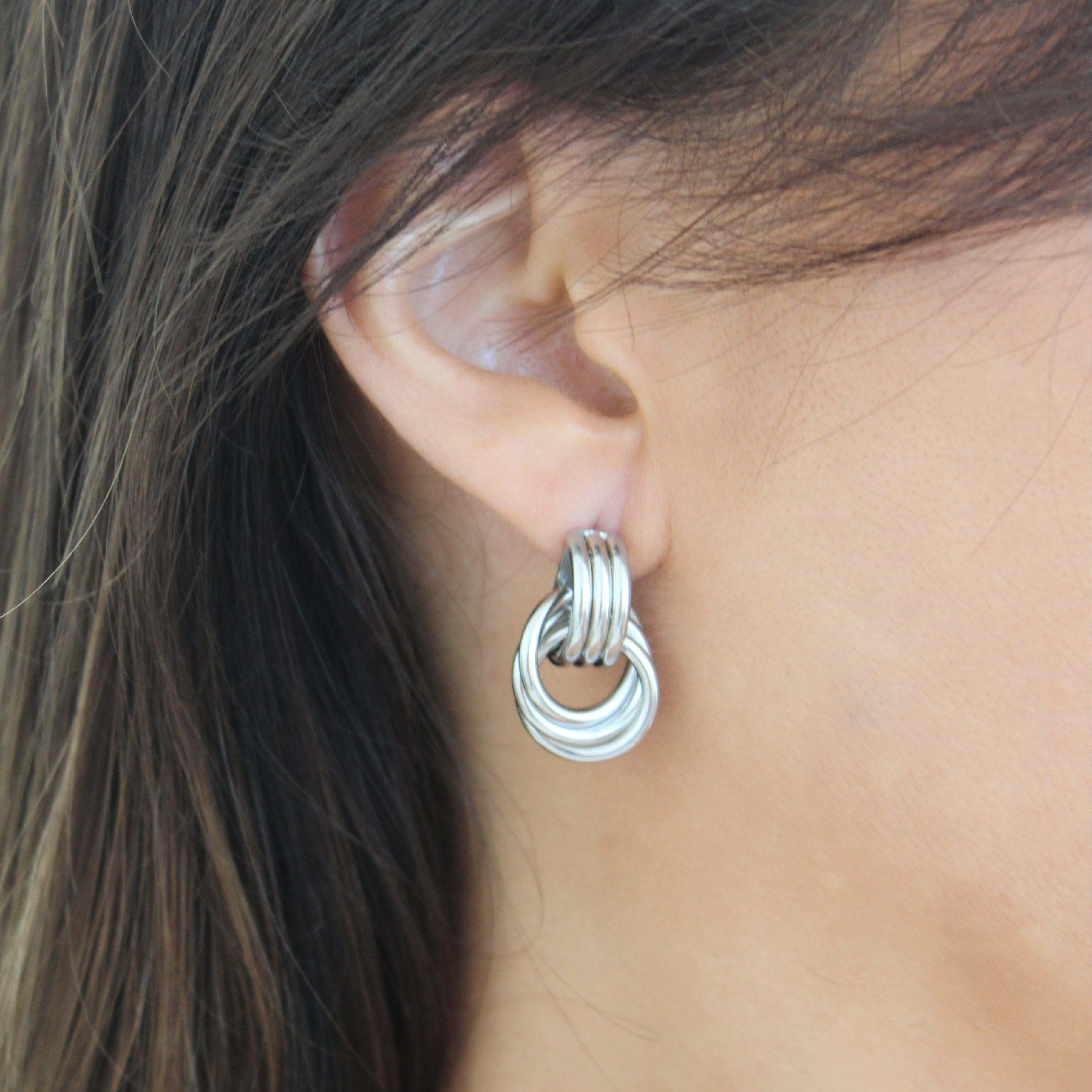 Audaces, atemporales y con un aire vintage que no pasa desapercibido. Estos aros de diseño oversize destacan por sus tres tubos entrelazados, que aportan volumen y movimiento con un toque de sofisticación. Fabricados en acero quirúrgico, son el accesorio perfecto para realzar cualquier look, de día o de noche.