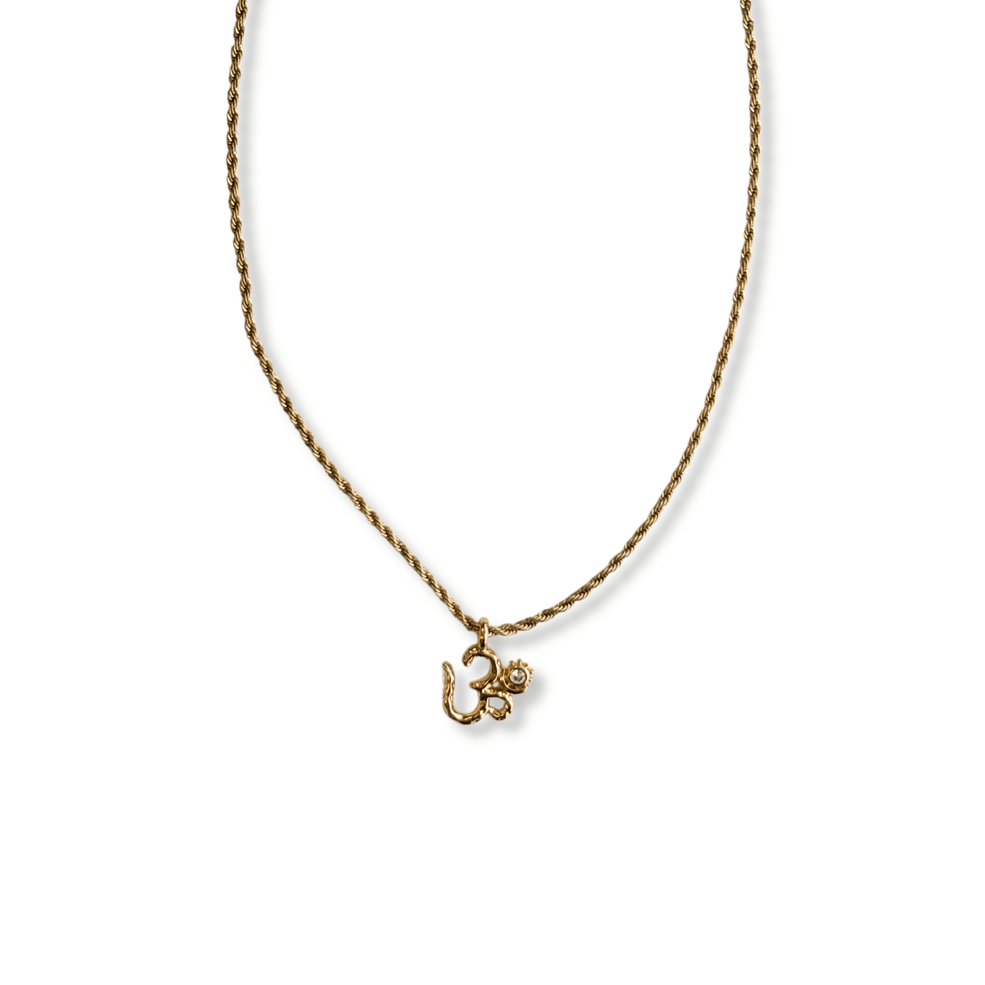 • Diseño: Cadena tipo turbillón de 45 cm con dije Om de 15 mm y cristal central