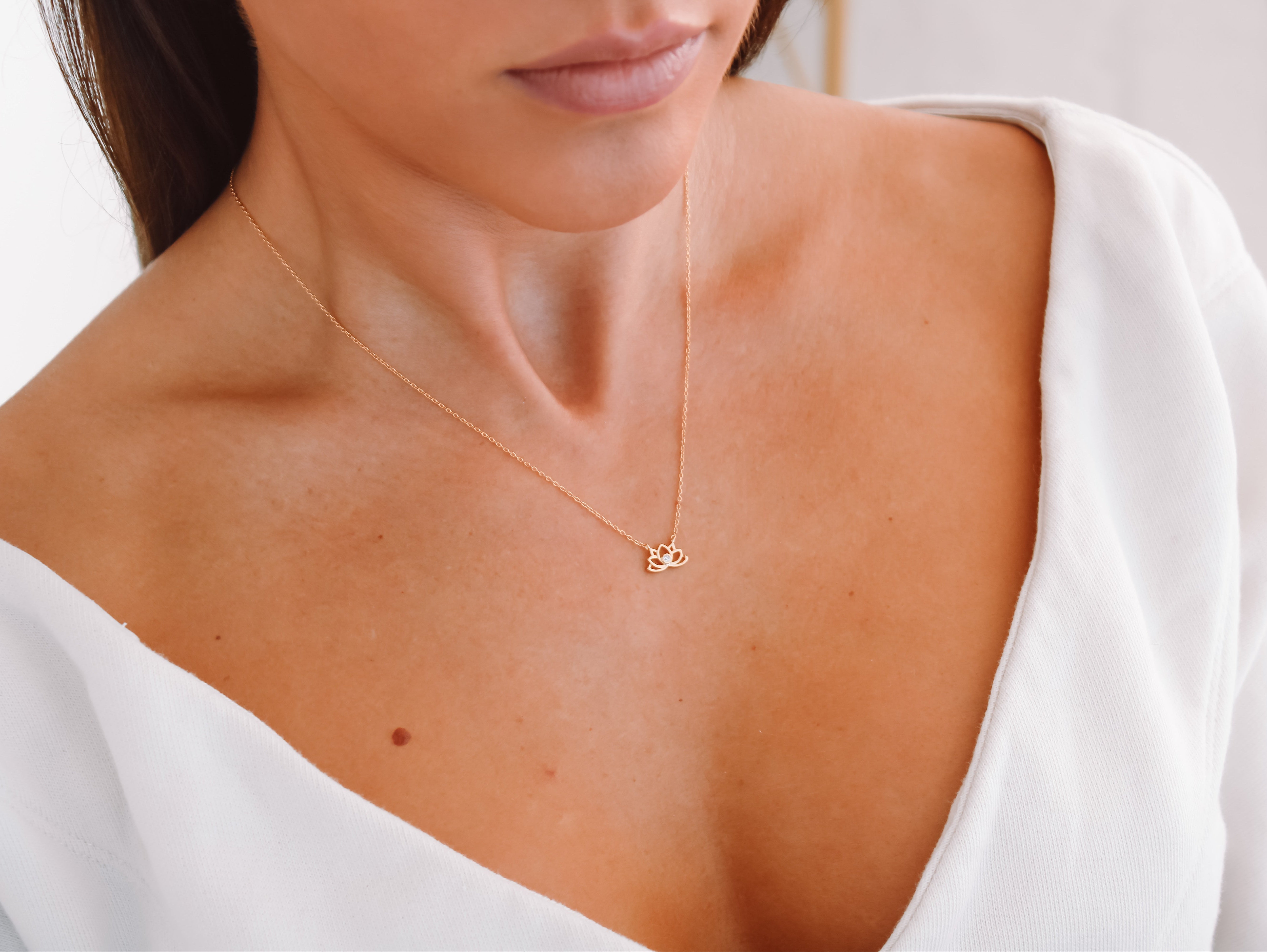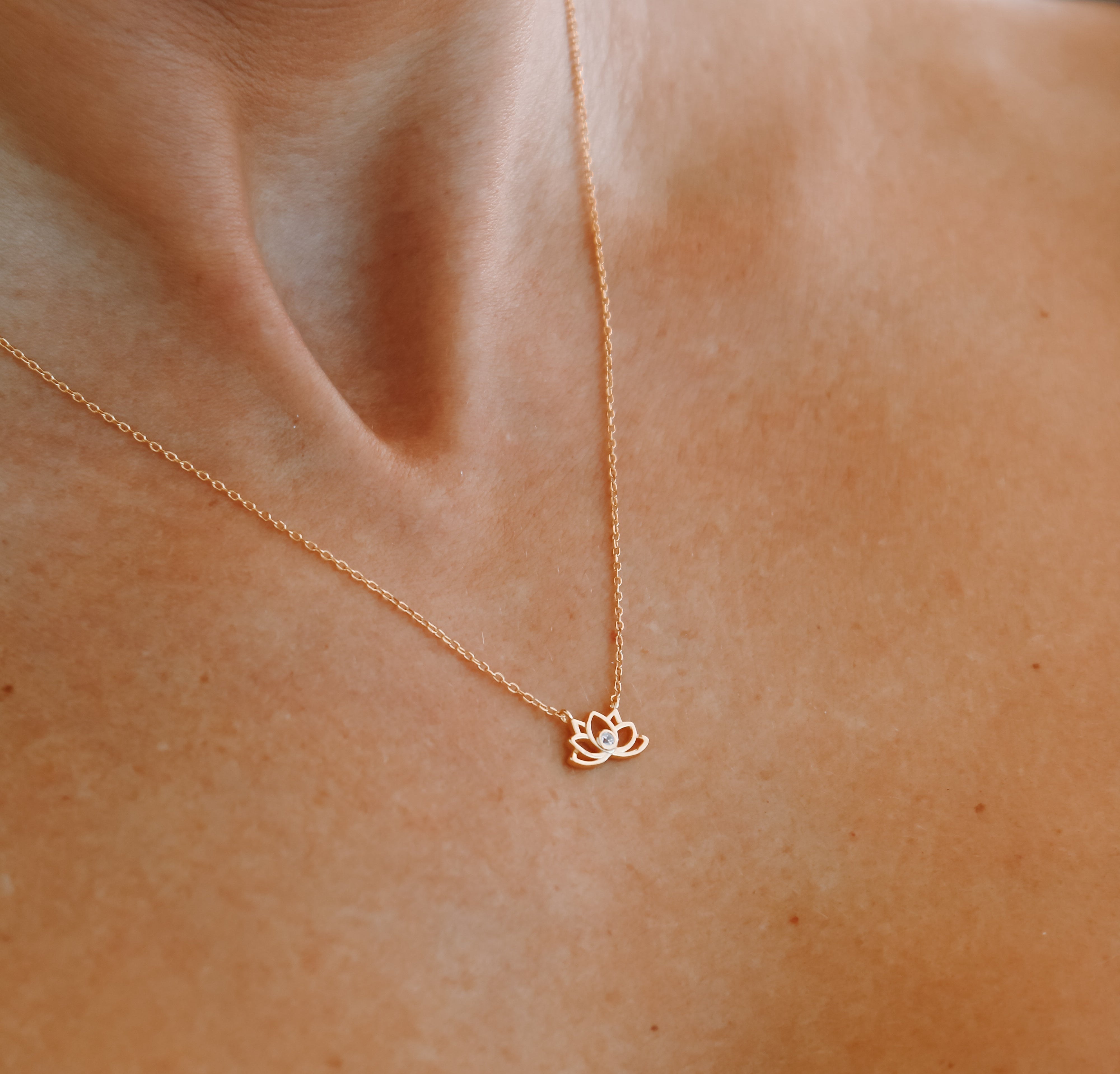Este delicado collar, con una cadena de 45 cm, presenta una hermosa flor de loto de 11x7 mm, símbolo de pureza y renovación. Elaborado en Plata de Ley 925, enchapado en oro 18k, es ideal para cualquier ocasión.