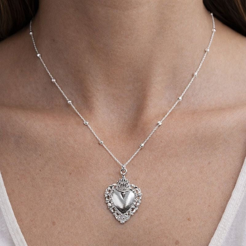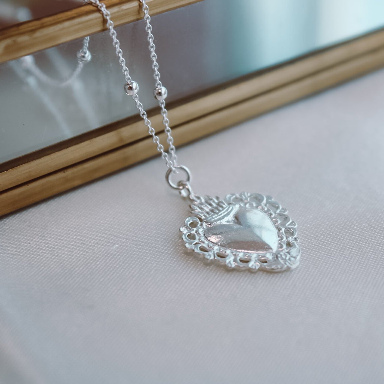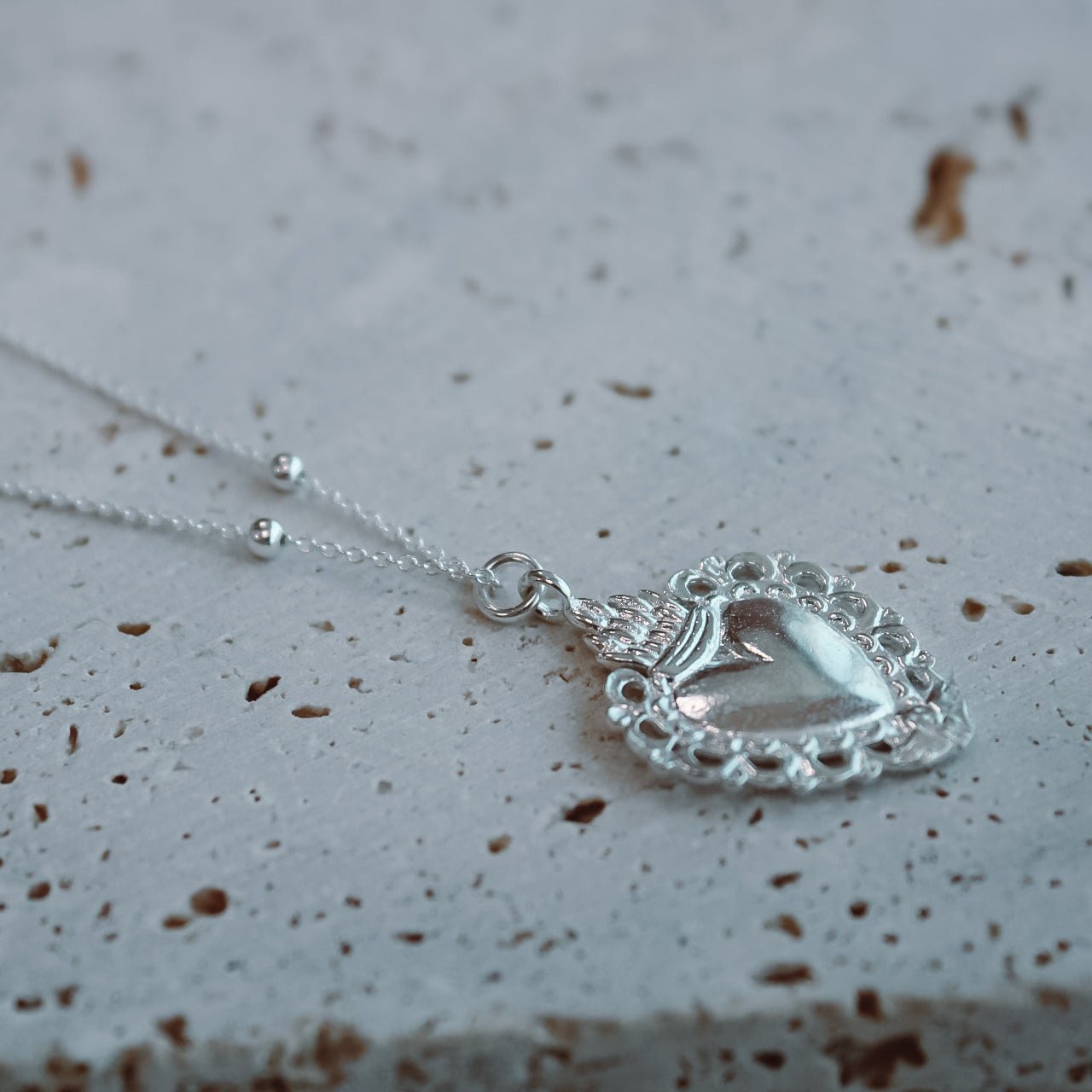 Collar Corazón Detente Tridimensional Un amuleto de protección y significado espiritual. Diseñado en plata de ley 925, su dije en forma de corazón macizo y reversible está finamente tallado con un ángel, símbolo de resguardo y guía. Una joya con presencia y profundidad, ideal para llevar siempre cerca del corazón.