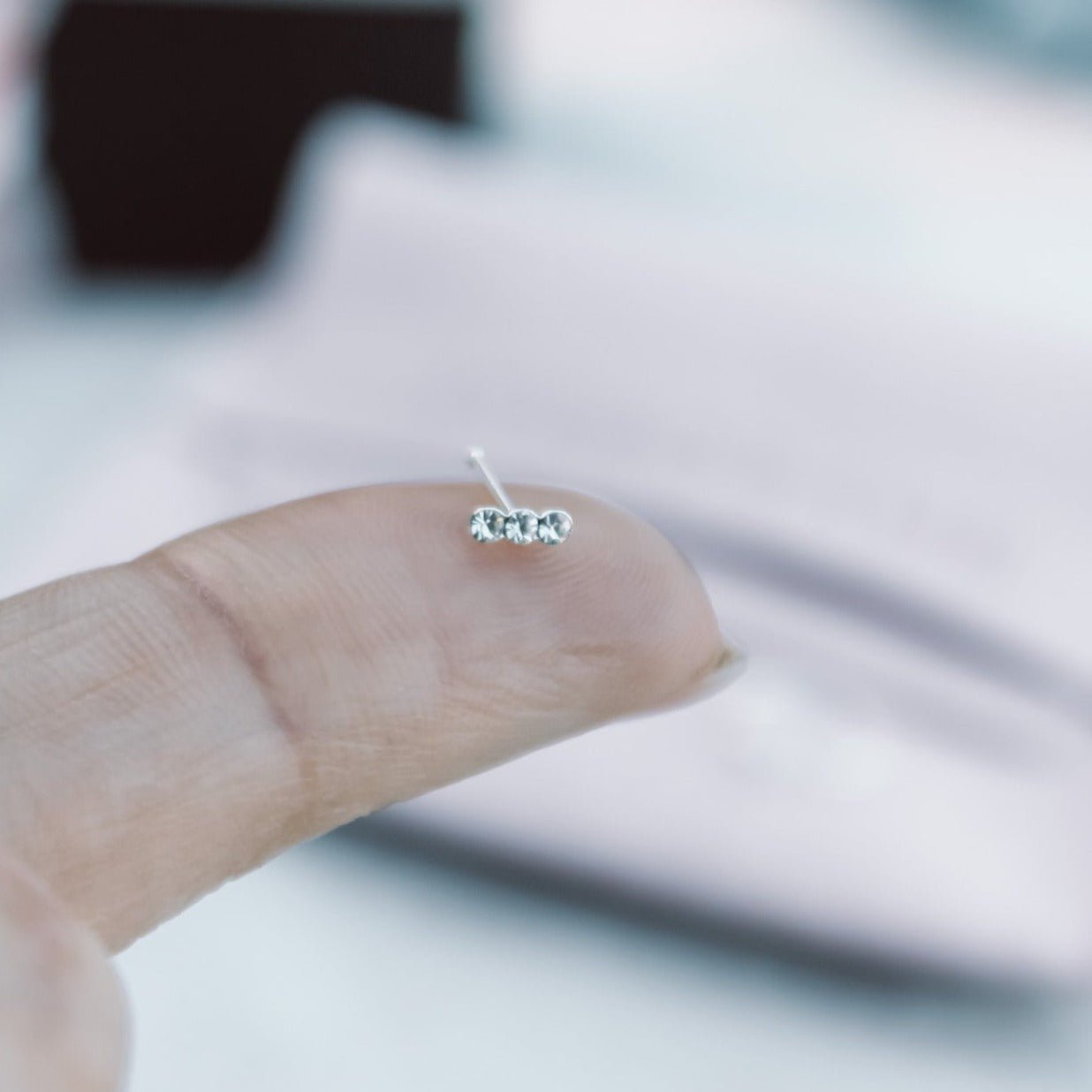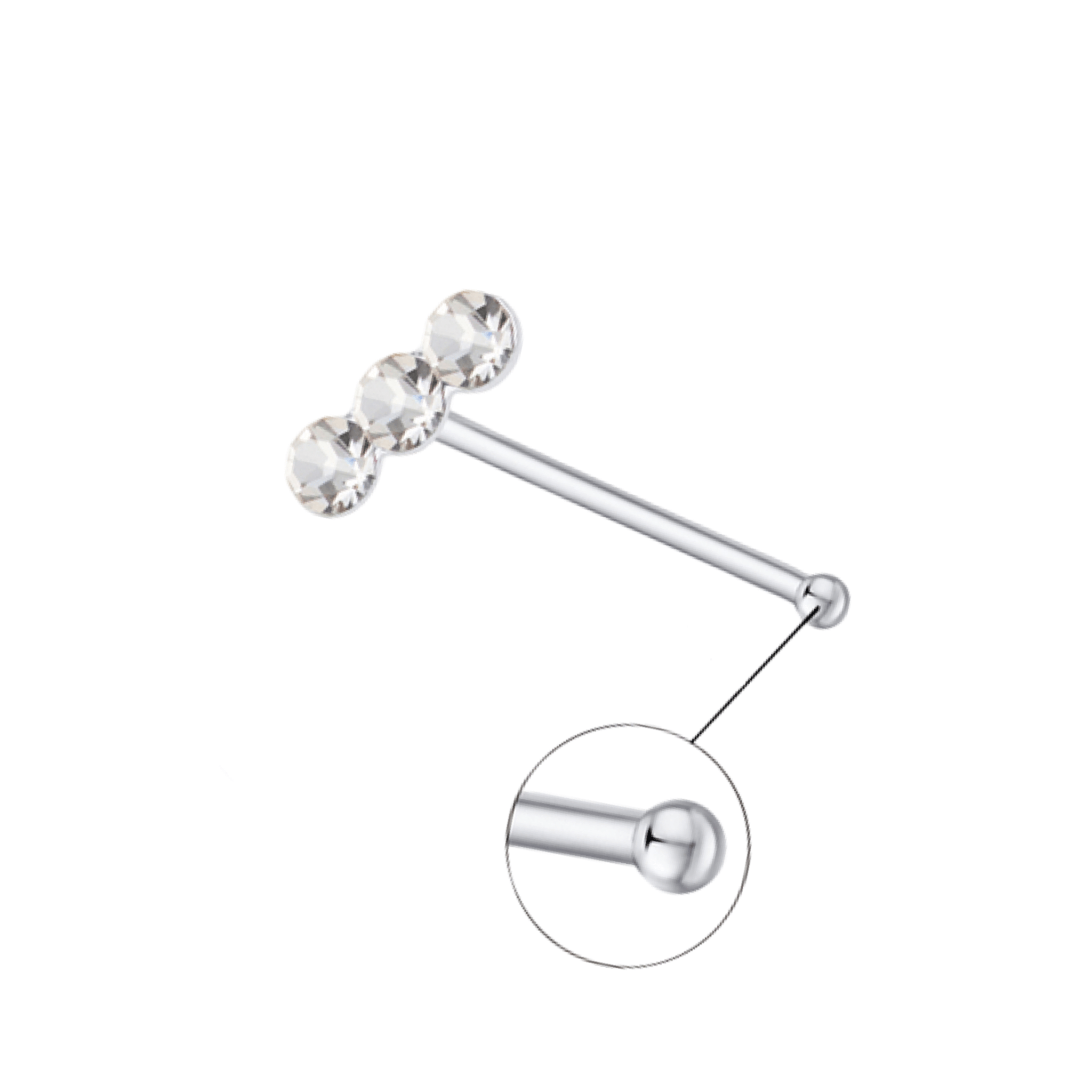Piercing para nariz, con diseño de tres mini cristales, fabricado en plata de ley 925. Fácil de poner y quitar, ligero y cómodo de llevar.