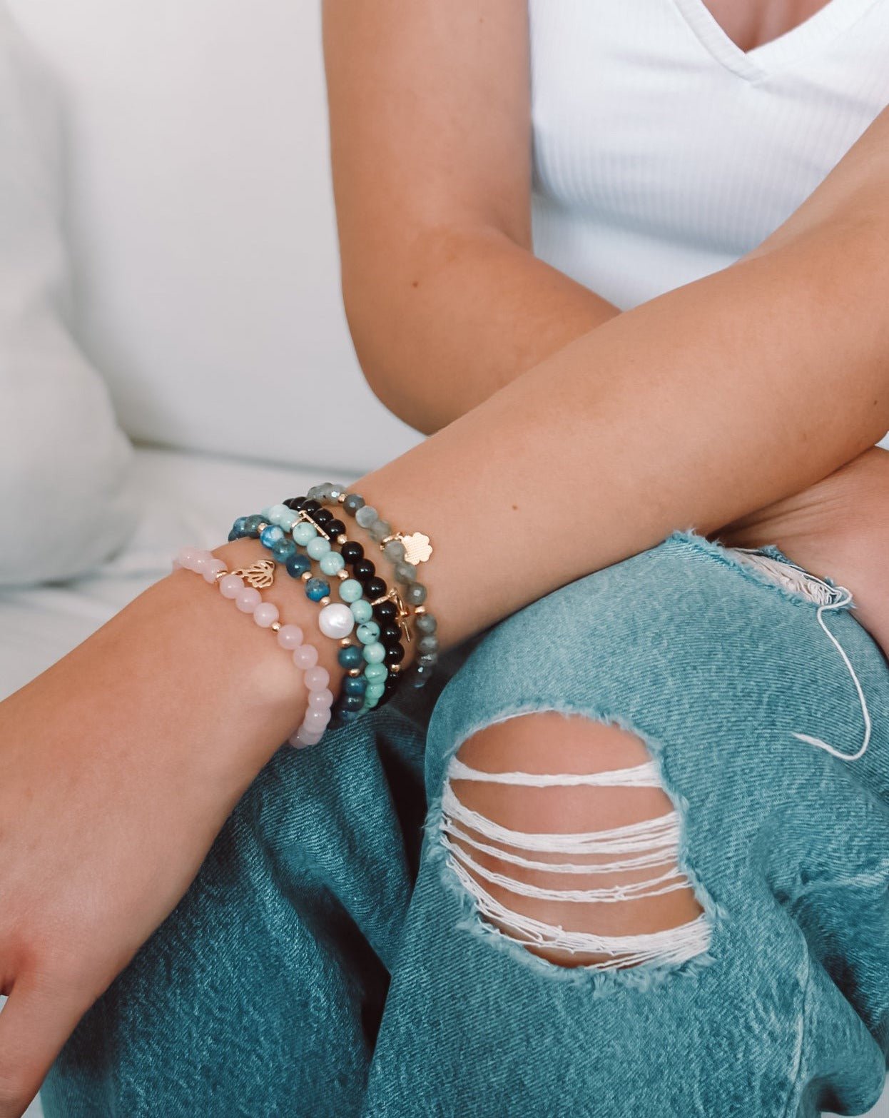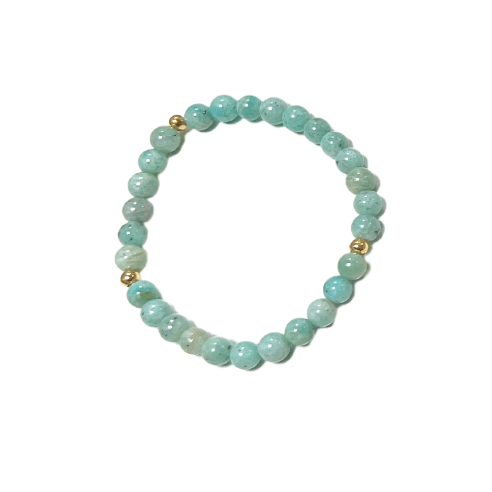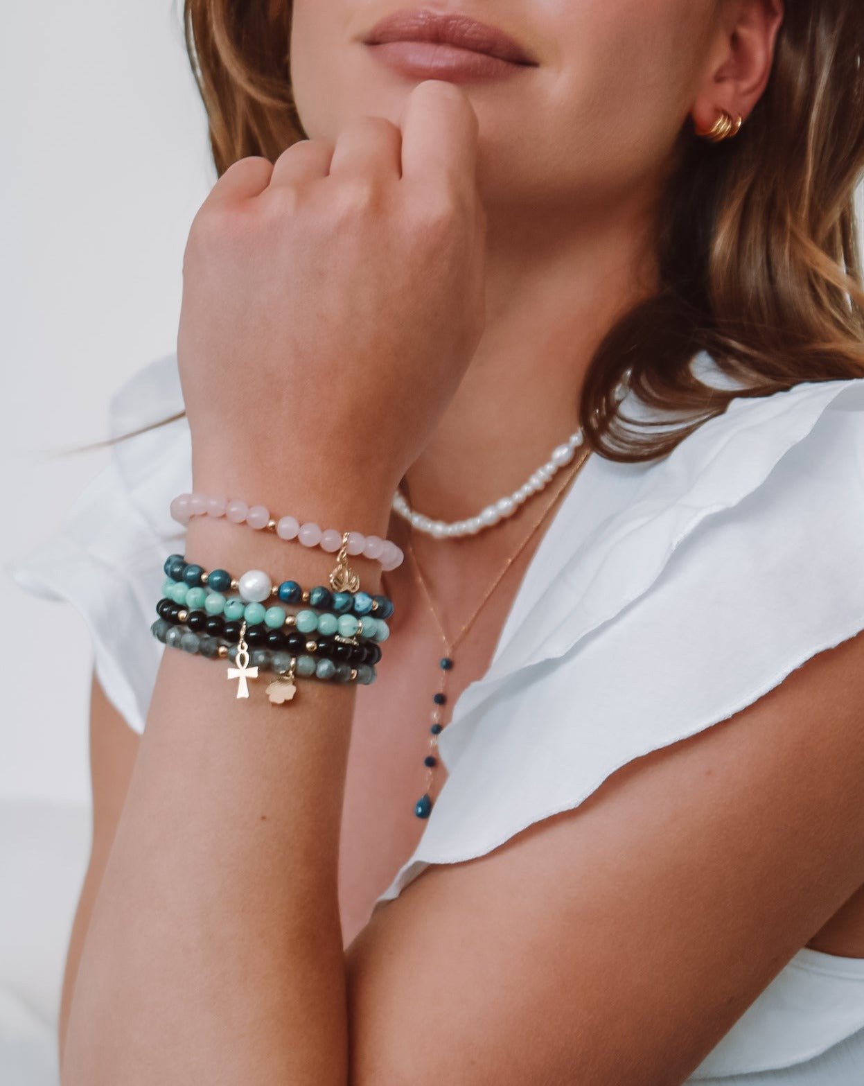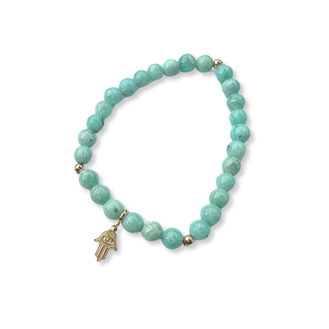 Descubre la tranquilidad y la seguridad con nuestra pulsera elástica de Amazonita natural. Cada pulsera incluye charms de protección a tu elección, bañados en oro de 18 quilates, libres de níquel y hipoalergénicos. La amazonita, conocida por sus propiedades de seguridad y curación, aporta equilibrio y bienestar emocional. Esta pulsera no solo es un accesorio elegante, sino también un amuleto poderoso para tu bienestar diario.