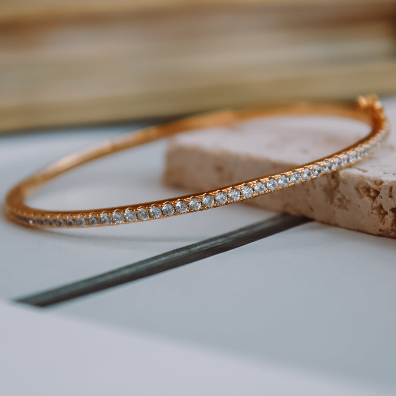 Su diseño fino y curvatura perfecta abrazan la muñeca con suavidad, mientras su broche con seguro garantiza un ajuste firme y cómodo para el uso diario o momentos especiales.