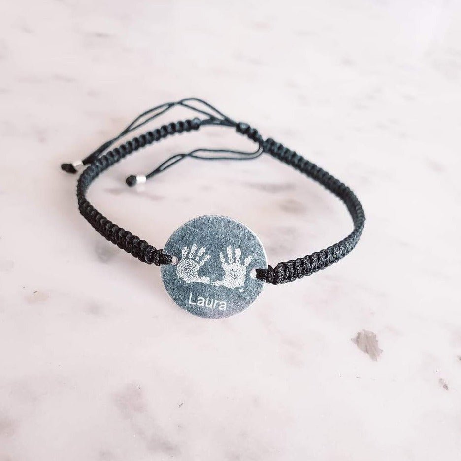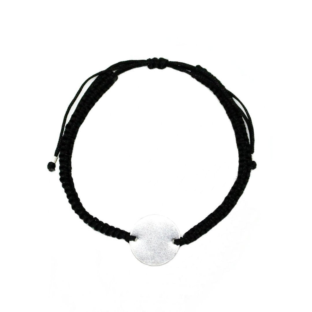 Pulsera Personalizada de hilo tejida ajustable. Se puede grabar por ambos lados de la medalla, con máximo 35 caracteres por lado.