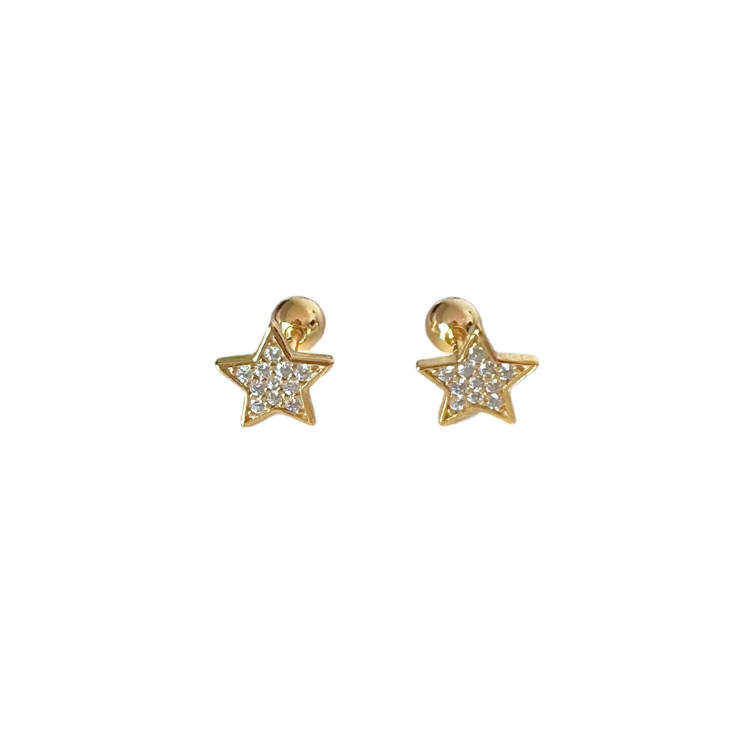 Aros de estrella para niñita, con mini circones. En plata de ley 925, con baño de oro 18k.
