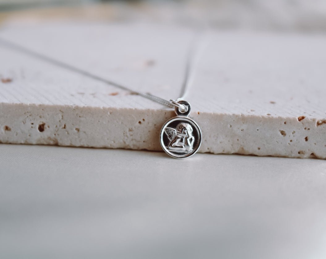 El Collar Ángel de la Guarda Petite está elaborado en plata ley 925 y presenta una delicada medalla con la figura del ángel protector, un amuleto clásico que representa cuidado, fe y resguardo.