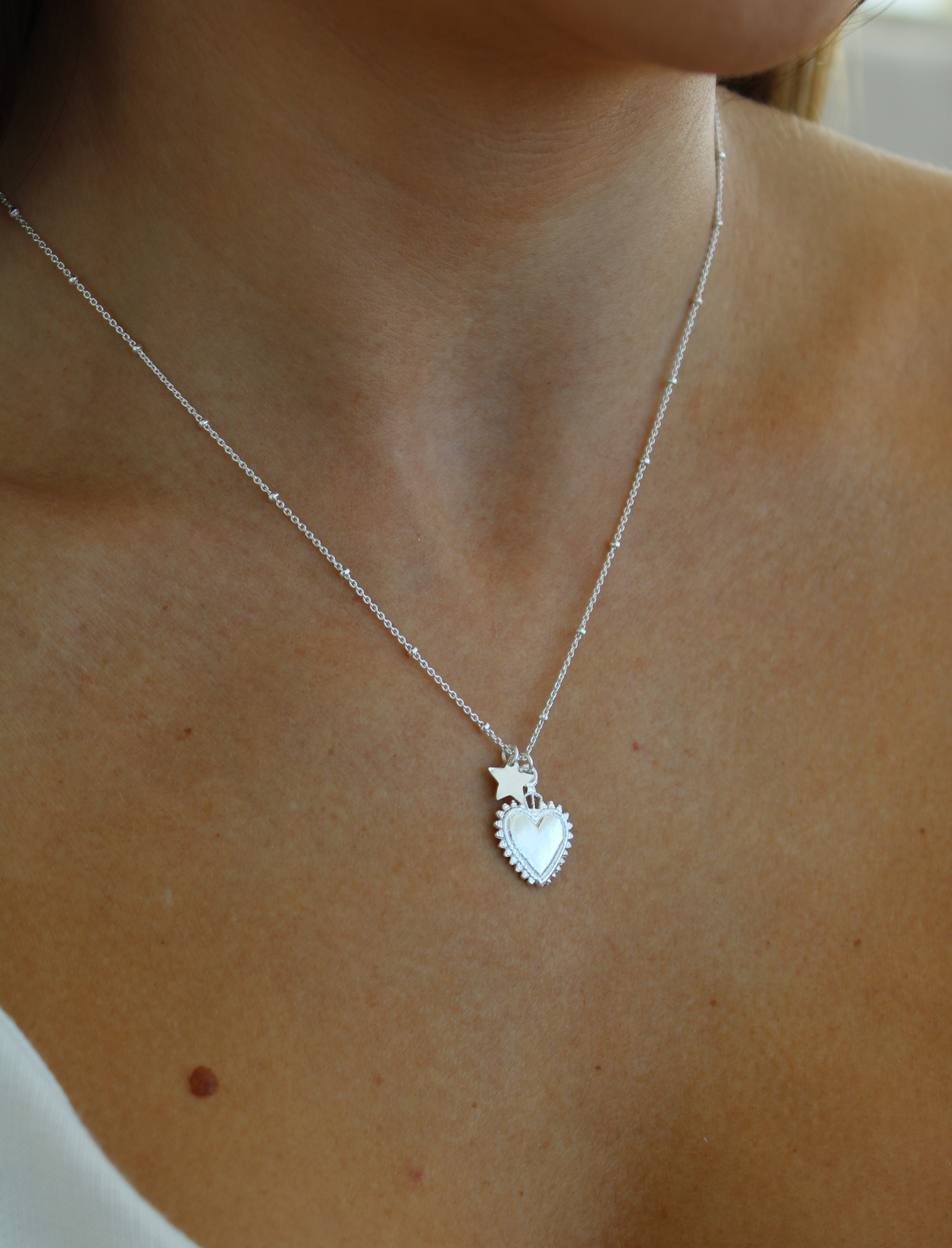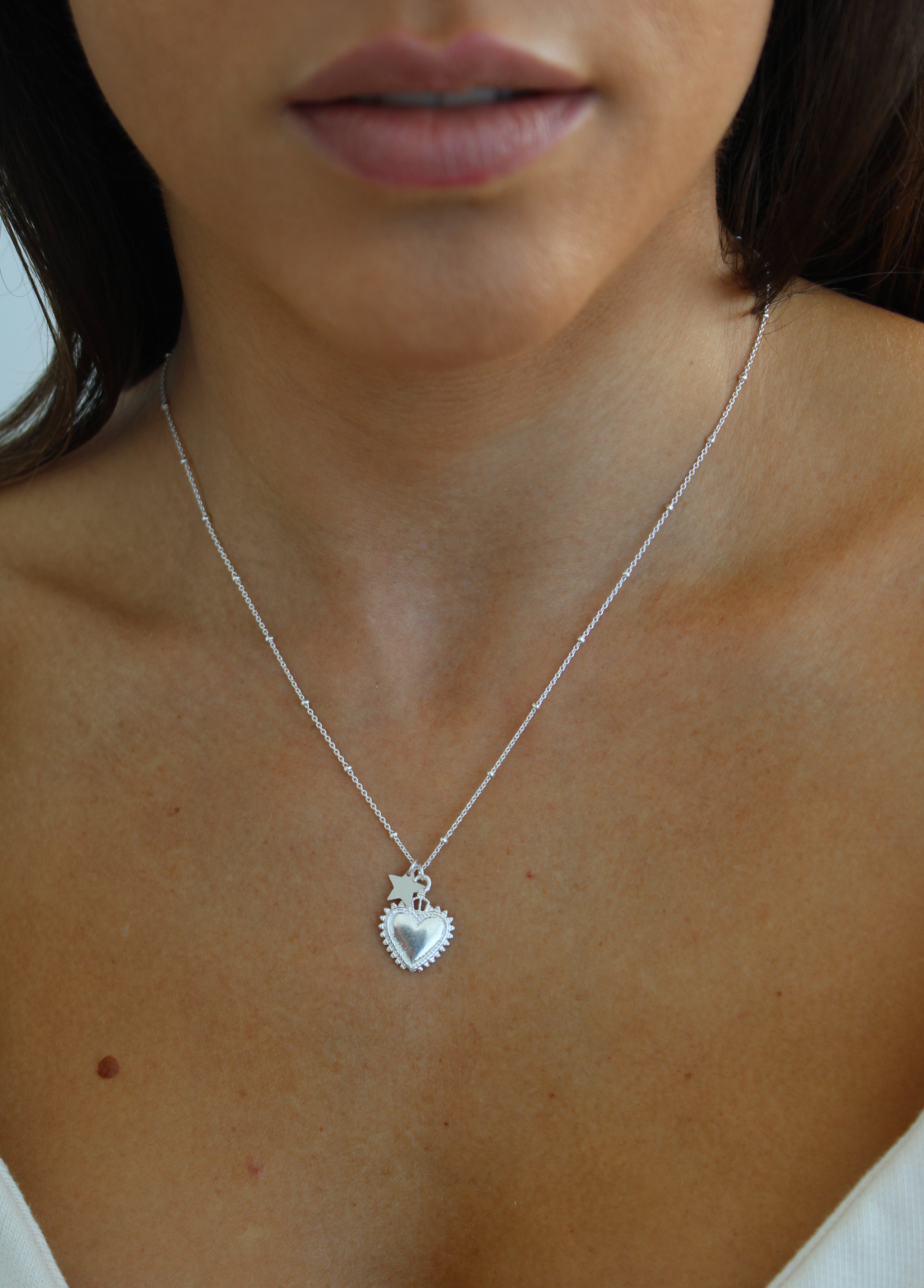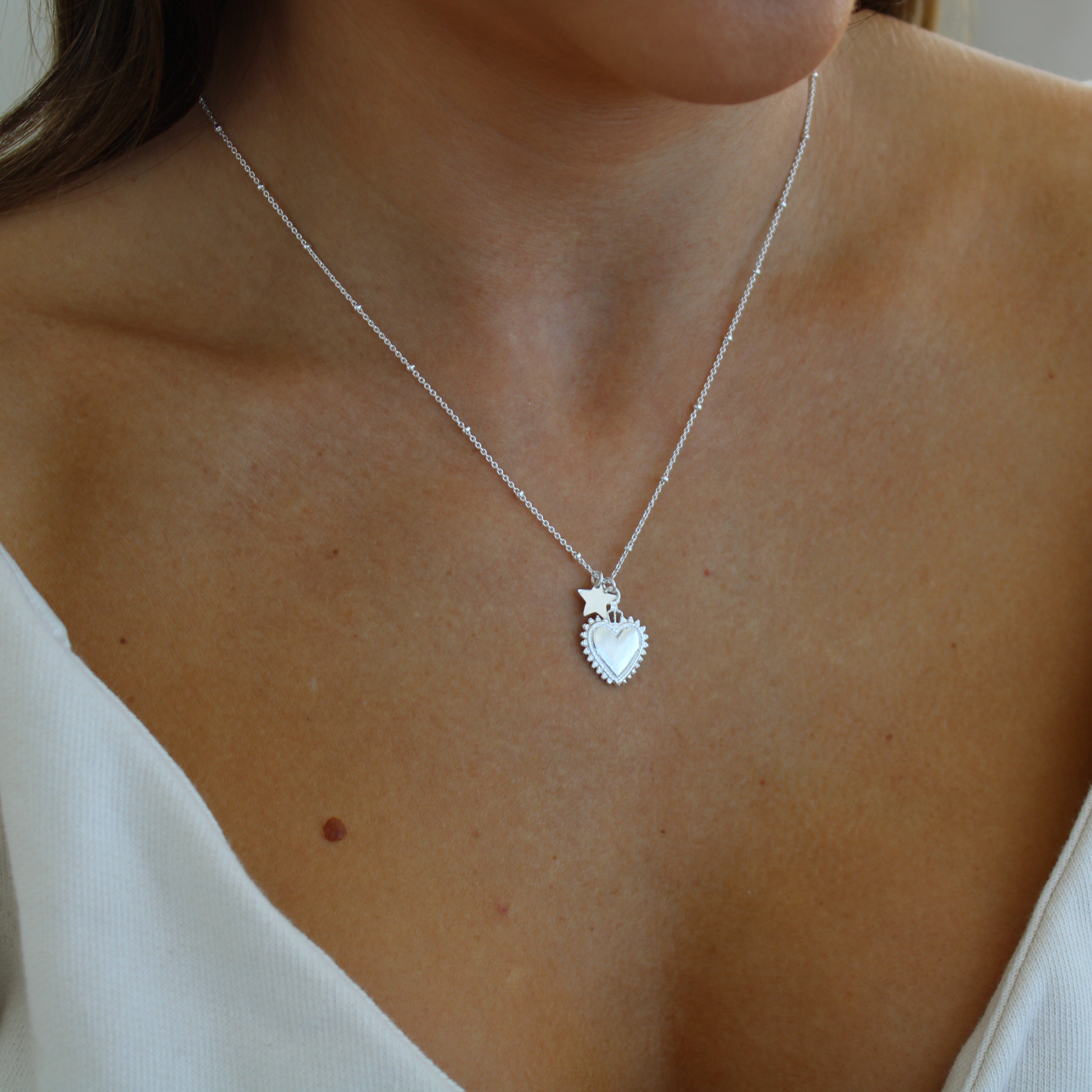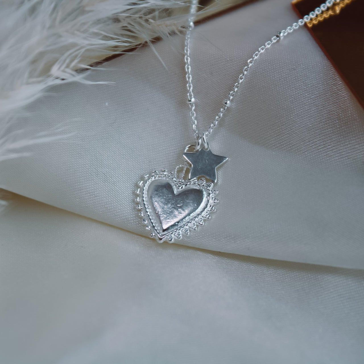Collar Detente Protector Personalizado – Un amuleto poderoso y significativo para llevar cerca del corazón. Este collar combina un corazón macizo y una estrella plana, ambos diseñados en Plata de Ley 925, pensados para acompañarte con intención y estilo.