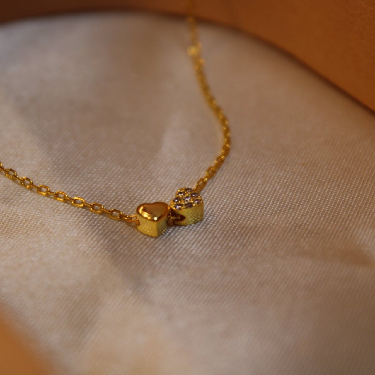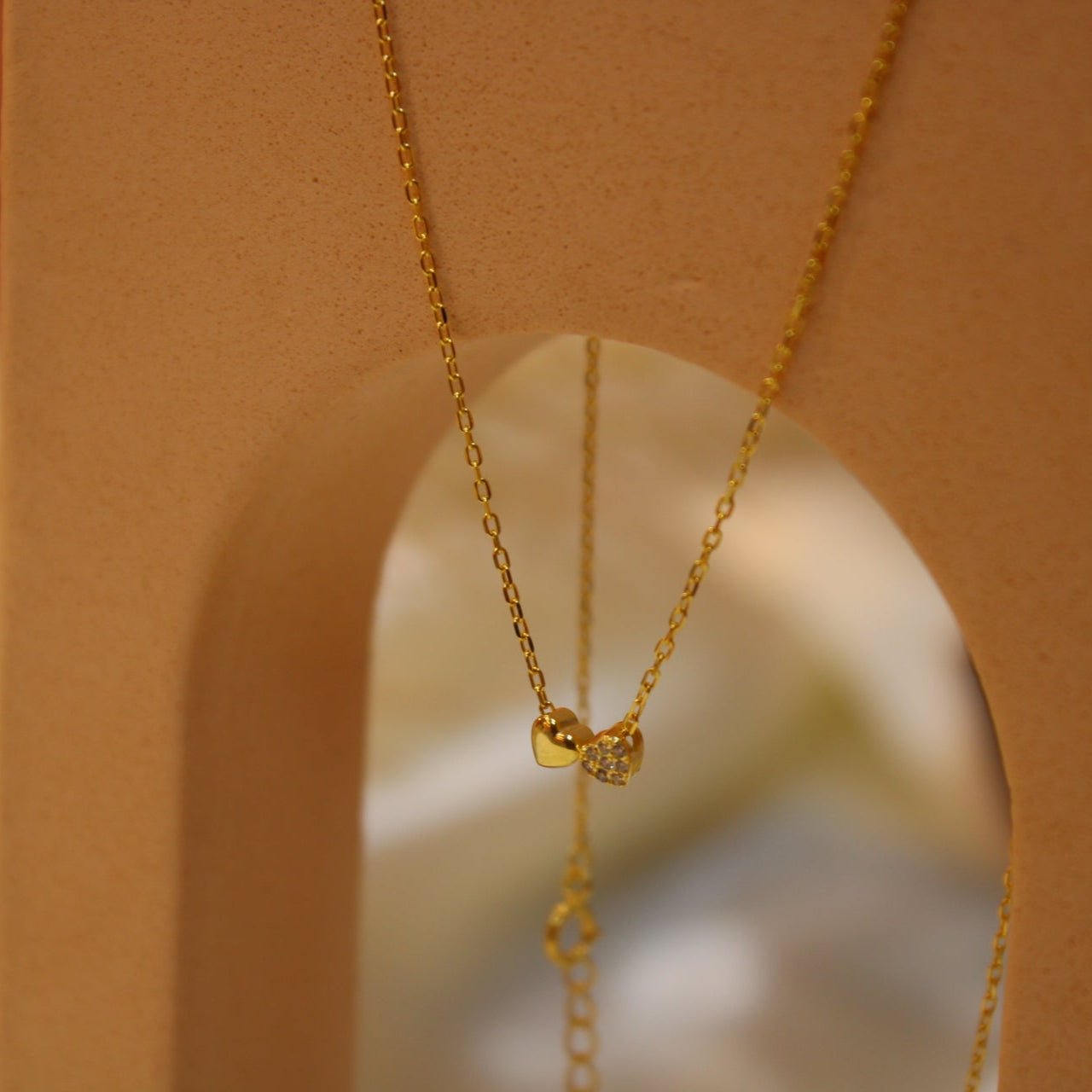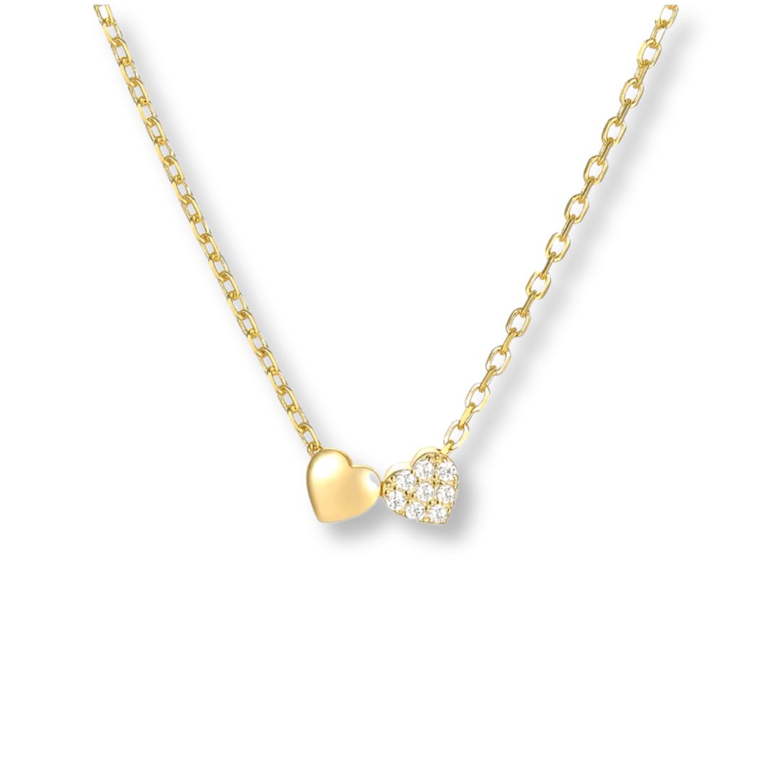 Un símbolo de unión y conexión entre dos personas. Este delicado collar en plata ley 925 presenta dos corazones móviles, uno liso y otro con mini circones, que se deslizan sutilmente a lo largo de la cadena, aportando un toque romántico y especial.