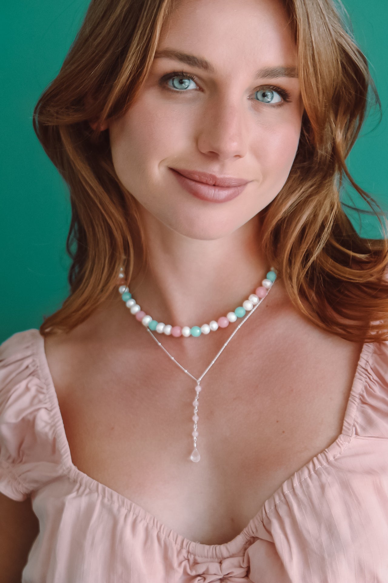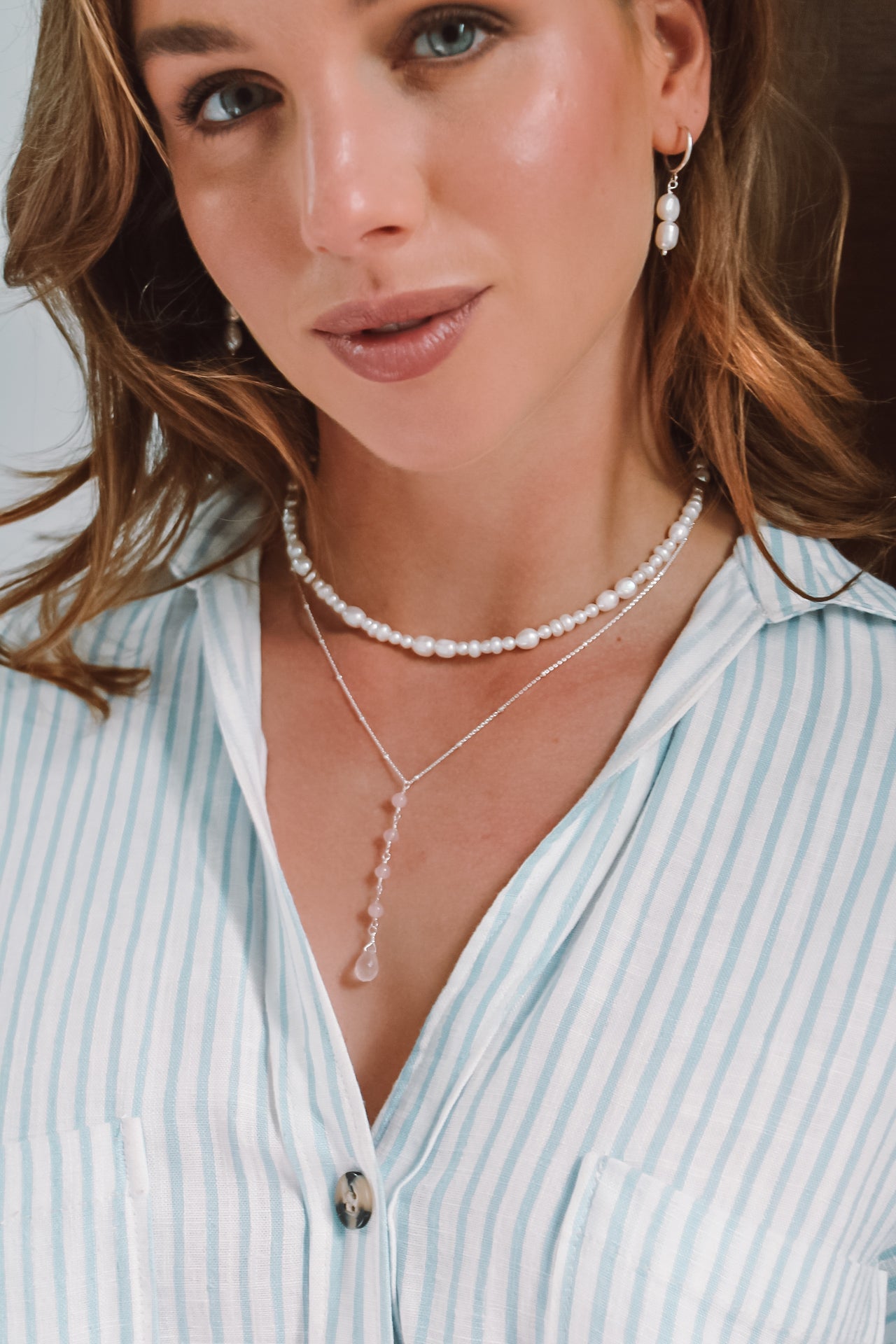 Collar Lariat Piedras Naturales Cuarzo Rosa Plata