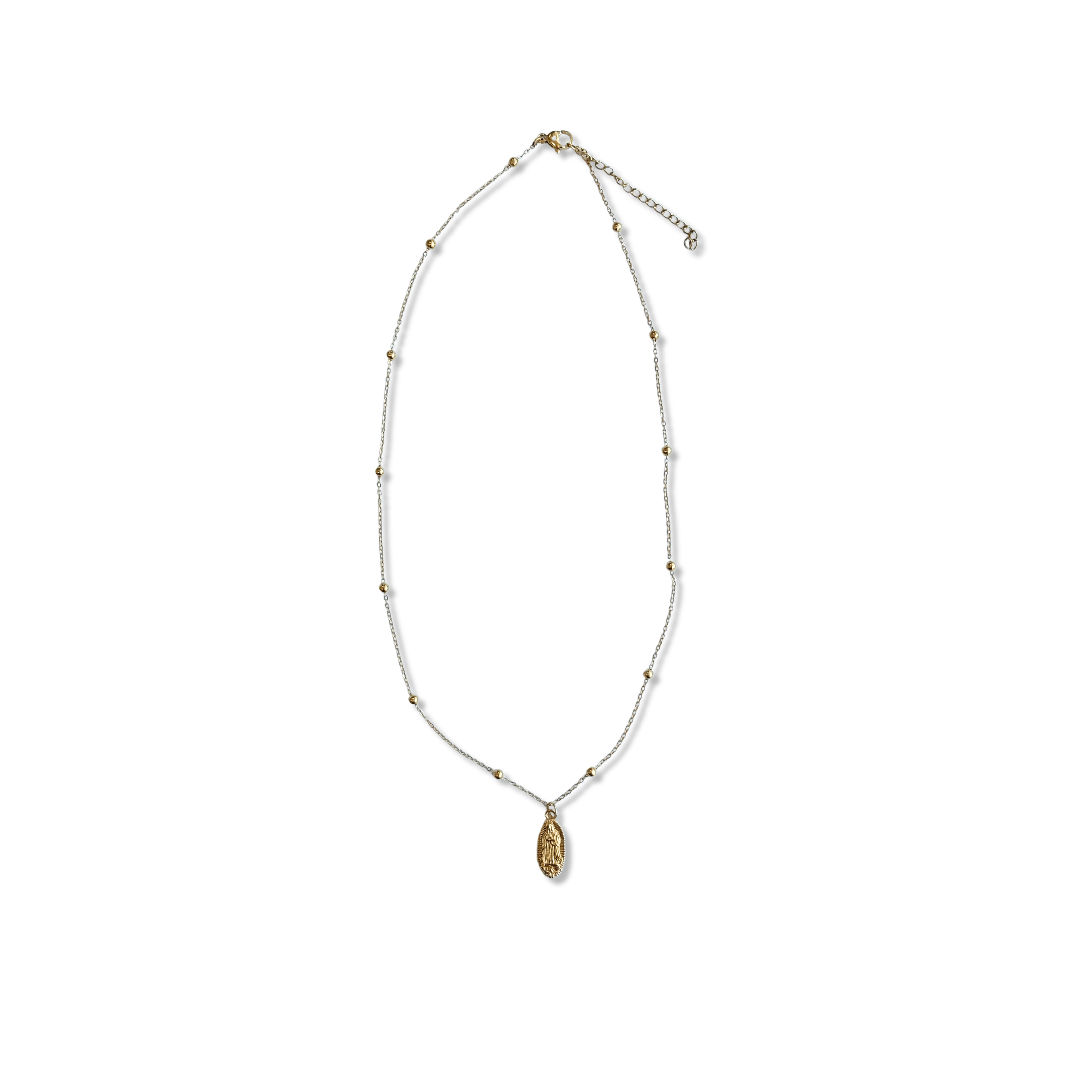 Un amuleto de devoción y luz que acompaña cada paso. El Collar Virgen de Guadalupe Gold está diseñado con una cadena fina con bolitas de acero inoxidable de 45 cm + 5 cm de extensión, y un dije de la Virgen de Guadalupe de 8 x 18 mm, con enchape de oro 18k mediante tecnología PVD.