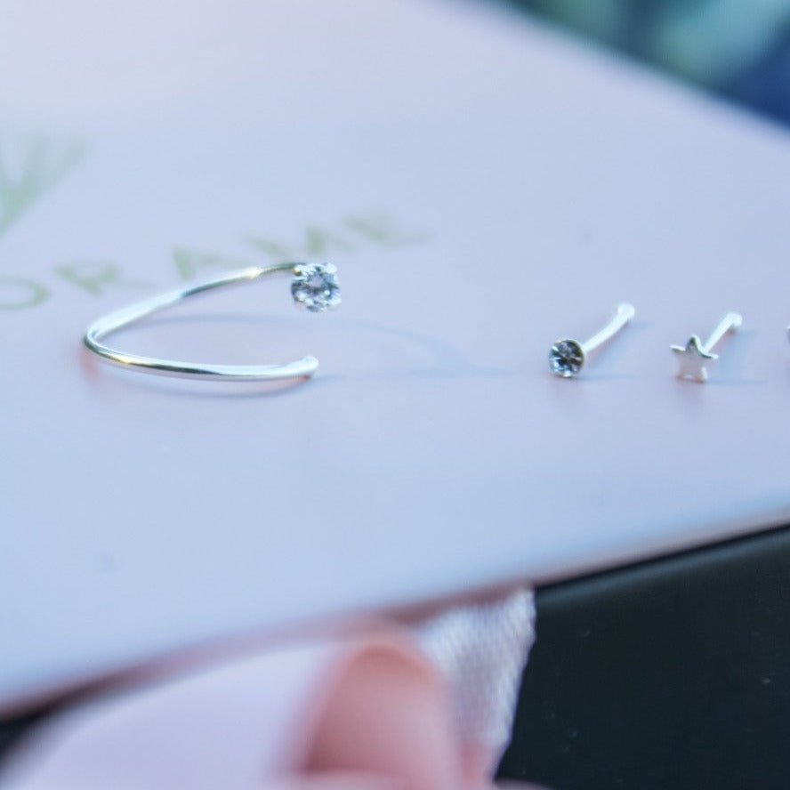 Piercing para nariz, tipo argolla con cristal de 2mm, fabricado en plata de ley 925. Fácil de poner y quitar, ligero y cómodo de llevar.