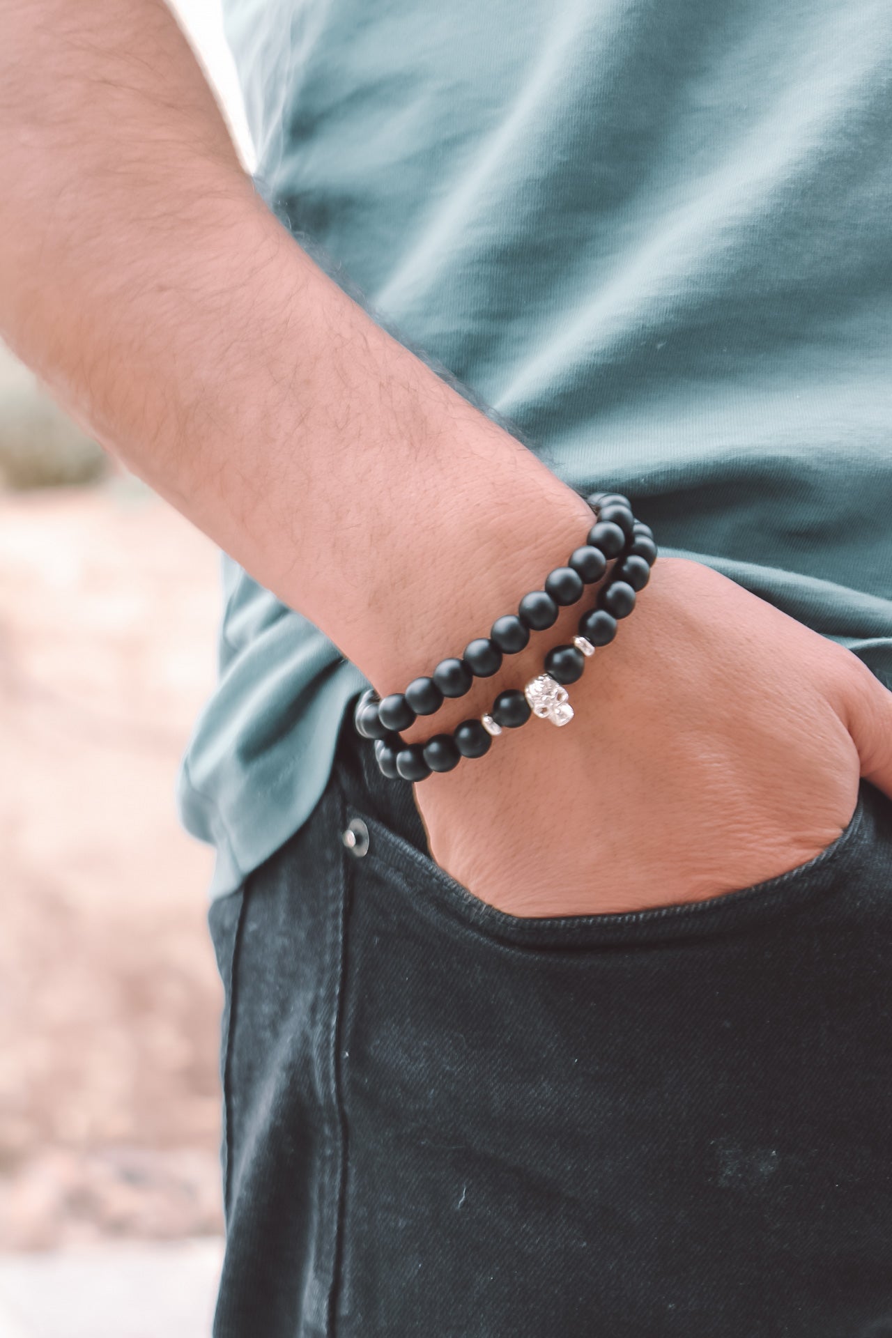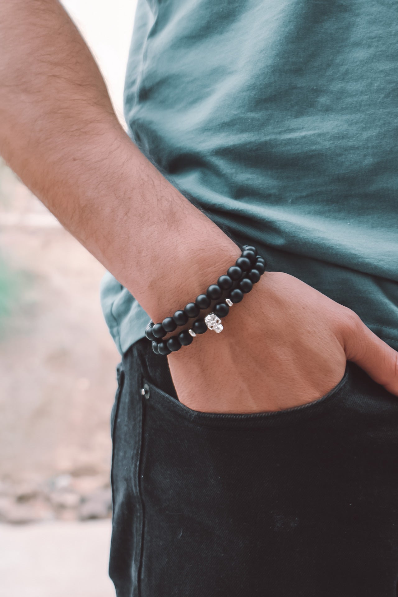 Diseñada en piedras naturales de 8mm onix matte y calavera en plata sólida de ley 925.