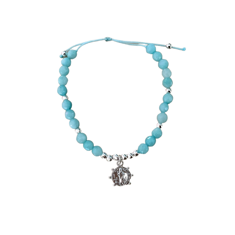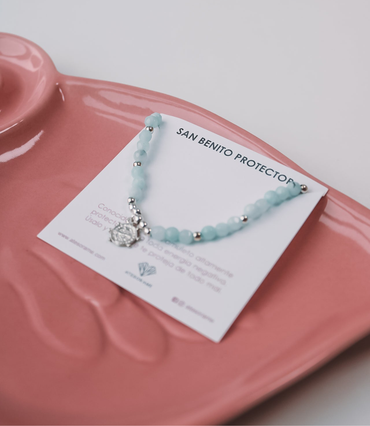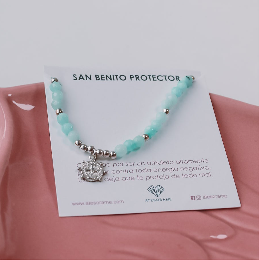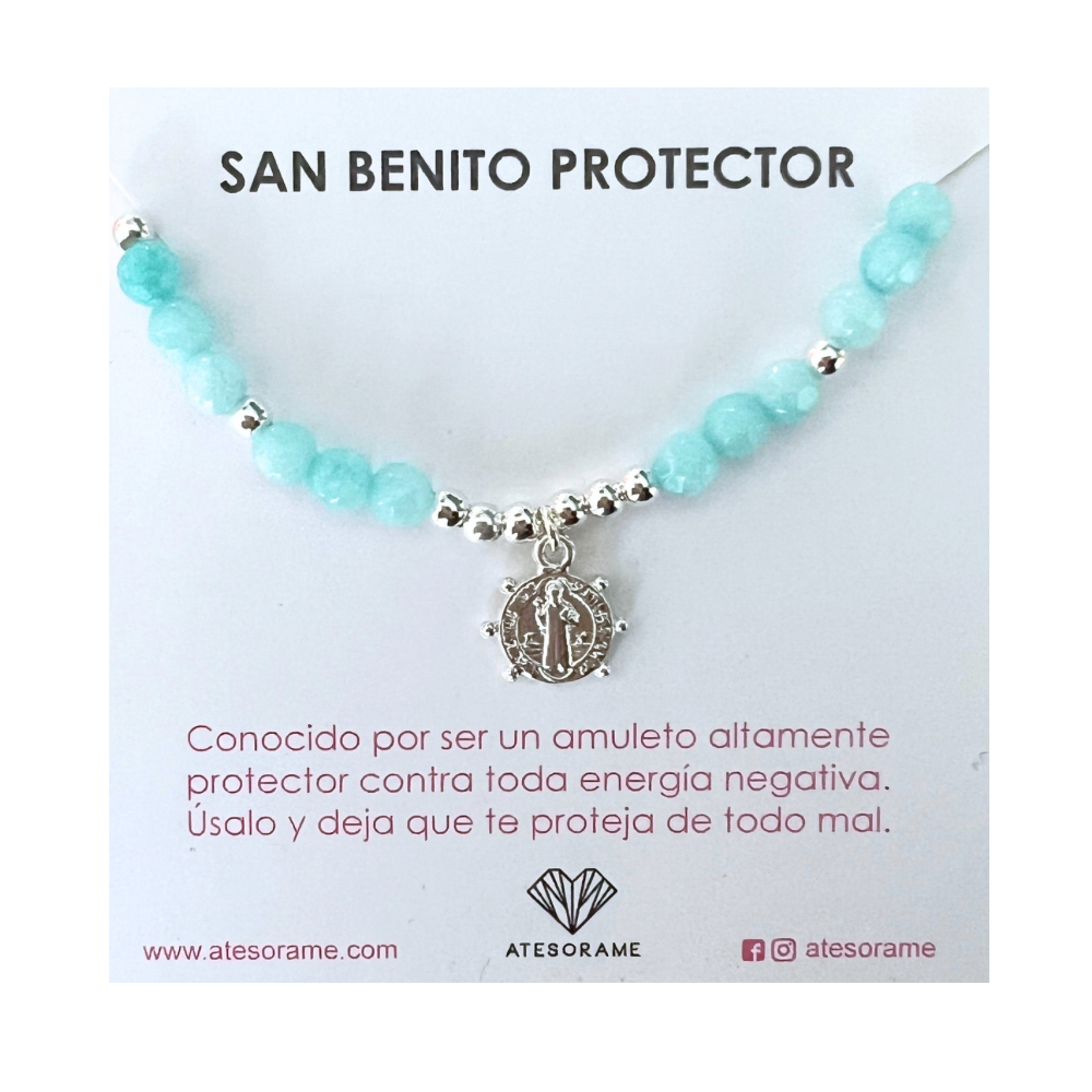 Pulsera de piedras naturales ágatas y medallita de San Benito Protector en Plata de ley 925.