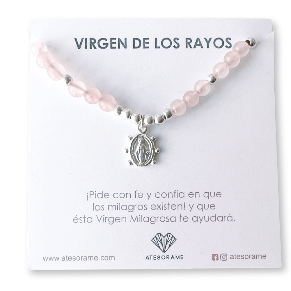 Materiales: Cuarzo rosa natural y medalla de la Virgen de los Rayos en plata de ley 925.