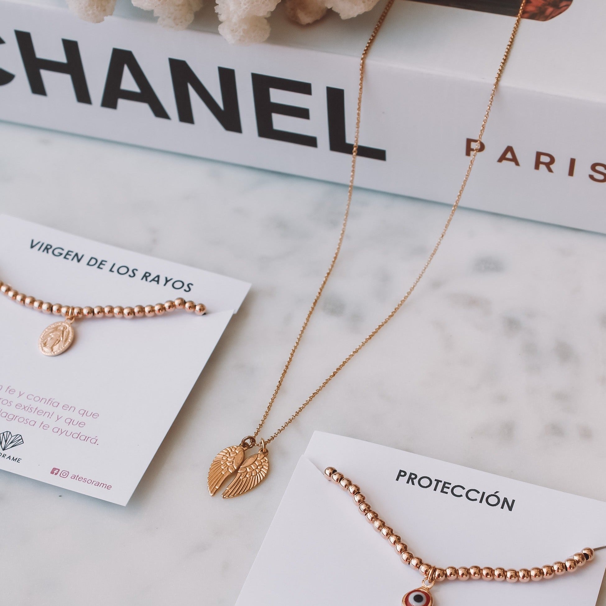 Pulsera virgen de los rayos, diseñada en bolitas y charm de goldfilled, baño de oro 18K tamaño ajustable.