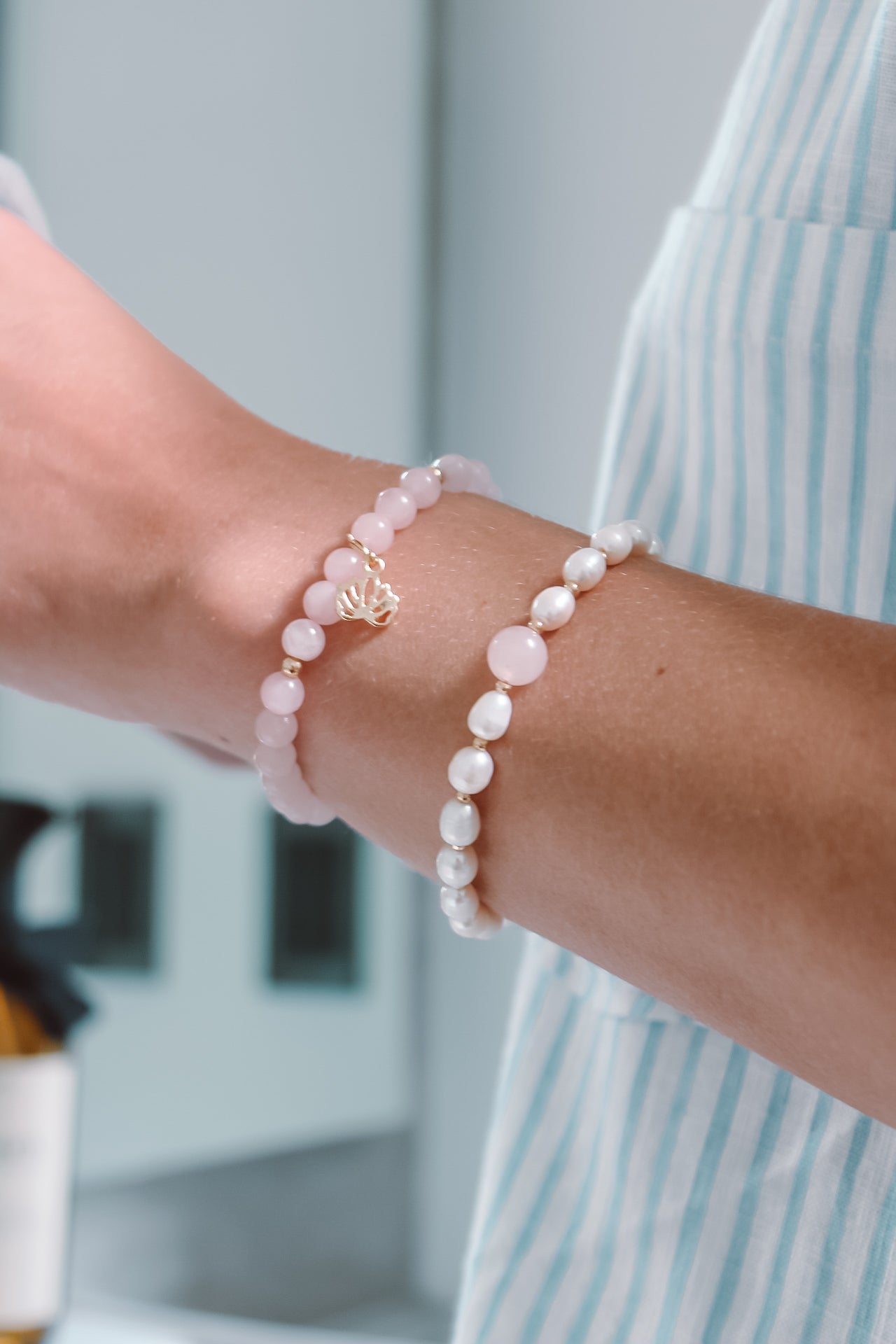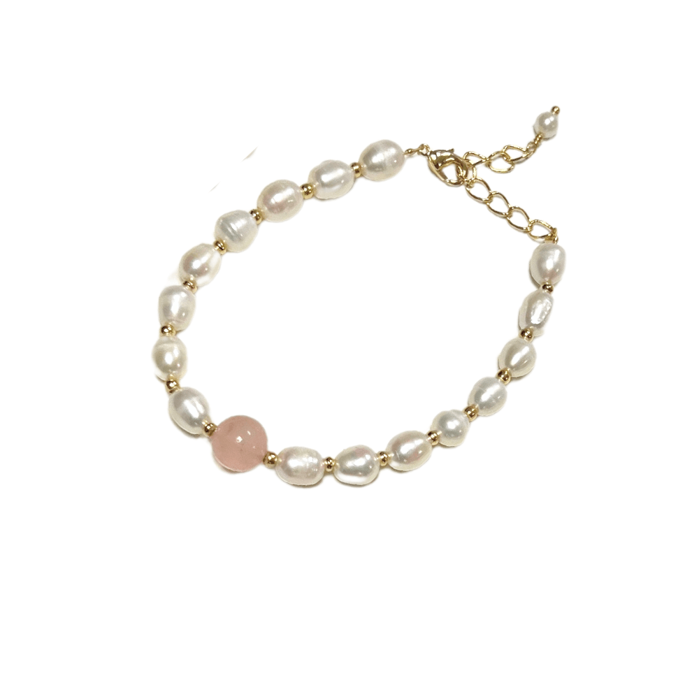 Embellece tu día con nuestra pulsera de perlas de agua dulce, potenciada con las propiedades del cuarzo rosado. Con detalles en baño de oro 18k, esta pulsera es hipoalergénica y libre de níquel, brindando un toque de elegancia y bienestar a tu estilo.