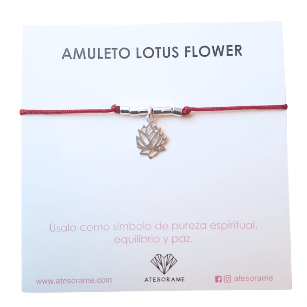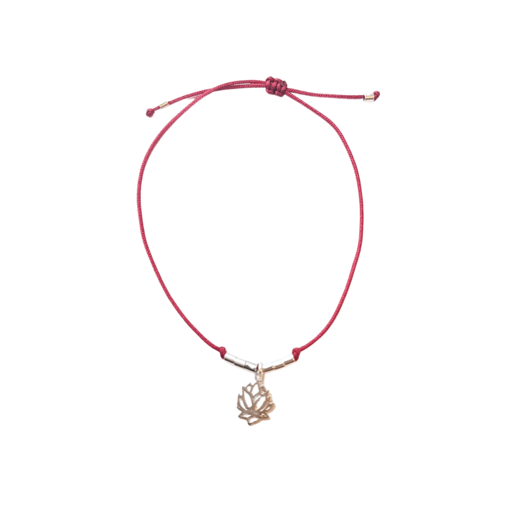 Pulsera hilo seda burdeo ajustable, con dije tallado en forma de flor de loto en plata de ley 925.