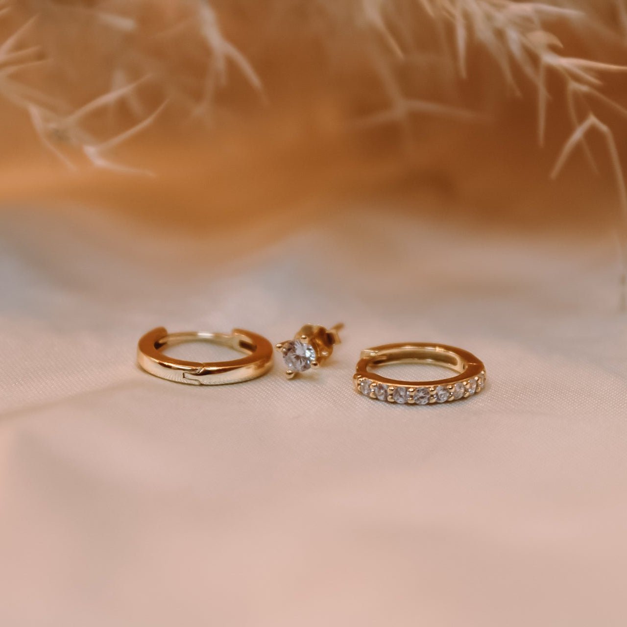 El set está compuesto por dos argollas de 11 mm, una lisa y otra con mini circones que aportan un destello sutil, junto a un aro punto de luz de 4 mm que entrega un brillo delicado y elegante.
